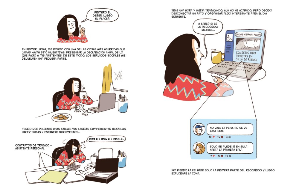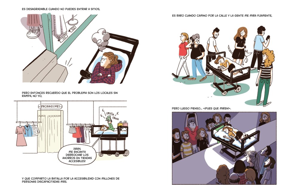 Este libro no es cómodo. Y no quiere serlo. Las viñetas incomodan, no porque sean violentas, sino porque son verdaderas, reconocibles, dolorosamente normales. Y esa normalidad es precisamente el problema. El capacitismo se cuela en los detalles: en el ascensor que no existe, en el trámite que exige presencia física, en la silla de ruedas que no cabe en el baño, en la condescendencia disfrazada de halago, en esos probadores que no tienen el tamaño adecuado. Todo esto lo muestran las Paolini con una claridad que enseña sin sermonear, con humor y con firmeza. Es una auténtica pedagogía del malestar: te hace ver lo que antes no veías, te obliga a revisar tus propios comportamientos, tus comentarios bienintencionados, tus silencios.