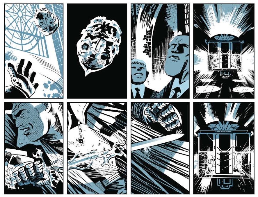 En lo gráfico, el arte de Víctor Santos despliega sus encantos a cada página, en una narración gráfica que simplemente atrapa por lo bien ejecutada y secuenciada. De forma que cada elemento dibujado cuenta por si solo, sugiere y aumenta el efecto de lo contado. Con un acertado bitono que predomina en la mayoría de las páginas, “Elixir” va creciendo en intensidad mientras se desarrolla, haciendo que este combate entre fe y ciencia convenga leerlo solo por ver la narrativa gráfica que encierra. Una que no esconde sus influencias gráficas, bien asimiladas y conjugadas en una visión fresca y personal. Con Frank Miller, Mike Mignola o Darwyn Cooke planeando en muchas páginas en las formas de resolver las composiciones y trazo, pero sintetizadas en la voz gráfica propia del lápiz de Santos. Uno que sigue perfilando frescura en cada trabajo que lleva a cabo. Que tiene ya un sello personal e inconfundible, el de un narrador gráfico notable, donde predomina una elegante voz propia.