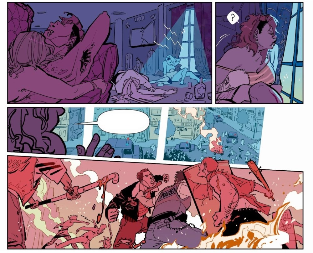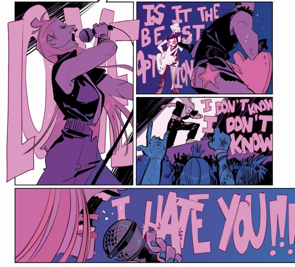 Las páginas van acertadamente, “in crescendo”, consiguiendo destilar la sensación de vértigo, egos desmedidos y juguetes rotos que produce su lectura. Unas páginas abordadas de forma soberbia por Dunia Navinés, que logra dar una personalidad propia a la obra, que la distingue del resto tanto por trazo – donde se ven influencias bien asimiladas como, por citar un ejemplo, Pasqual Ferry, por algunos angulosos perfiles de los personajes dibujados – como por los atractivos colores con los que baña la historia. Todo en unas composiciones de página que saben sacar el máximo jugo posible a lo que cuenta, que suenan a concierto, donde se siente la emoción de la interpretación, la tensión del backstage, los fluidos carnales y los excesos de cualquier tipo. Páginas vivas, en definitiva, que conforman una lectura notable.