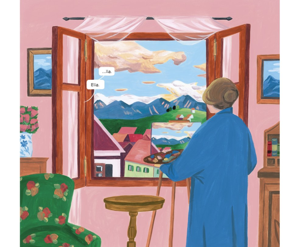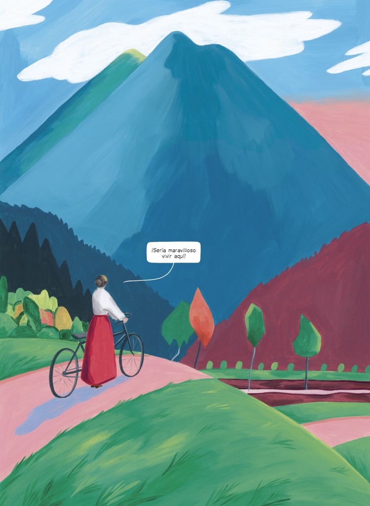 Desde el punto de vista gráfico, es una obra de contención y lirismo. Alvarado no imita el estilo de Münter, pero sí lo respira. Hay en sus páginas una economía poética, una paleta de colores que no busca reproducir, sino sugerir. No hay caricatura, ni reconstrucción historicista. Hay estaciones. Hay clima. Hay textura emocional. Las viñetas abiertas como acuarelas, funcionan como ventanas. A veces son amplias y contemplativas. Otras, íntimas y cerradas. Pero siempre invitan a mirar más allá. A preguntarse qué hay fuera del marco. Como si cada imagen fuera solo un fragmento de algo más vasto, más profundo.