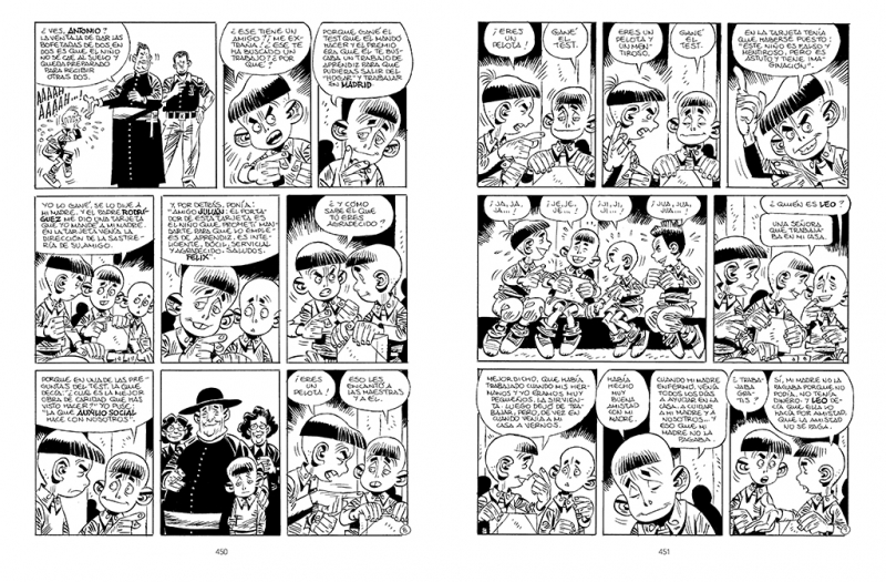 Ese fue el entorno de los niños que crecieron en los Auxilios Sociales de la época. Uno en el que ha pesar de la dureza y los castigos corporales, se forjaron amistades inquebrantables y se vivieron anécdotas. De ellas se ha nutrido Carlos Giménez, de las que vivió el mismo y sus compañeros y amigos. Son las que ha ido contando durante estos casi cincuenta años en estos tebeos. Dibujadas con precisión y narradas desde la cercanía.