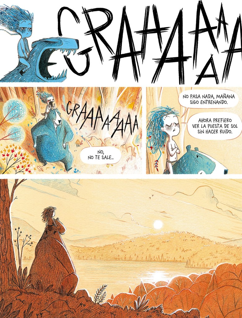 Ingrid Chabbert construye el guion con una ligereza engañosa. Todo parece sencillo, casi minimalista, pero detrás de cada frase corta y cada silencio se esconde un alud de emociones. Elma habla, salta, se queja, canta. Es una niña real, hecha de carne, hueso y hojas secas pegadas a los pies. Papá Oso es la encarnación de todos los padres del mundo que aman con torpeza, que no saben cómo explicar lo inexplicable y que prefieren caminar al lado de sus hijos un poco más, aunque el final esté escrito desde el principio. El texto fluye con naturalidad, con ritmo pausado y sin necesidad de subrayar lo obvio. Porque lo esencial está en los dibujos.