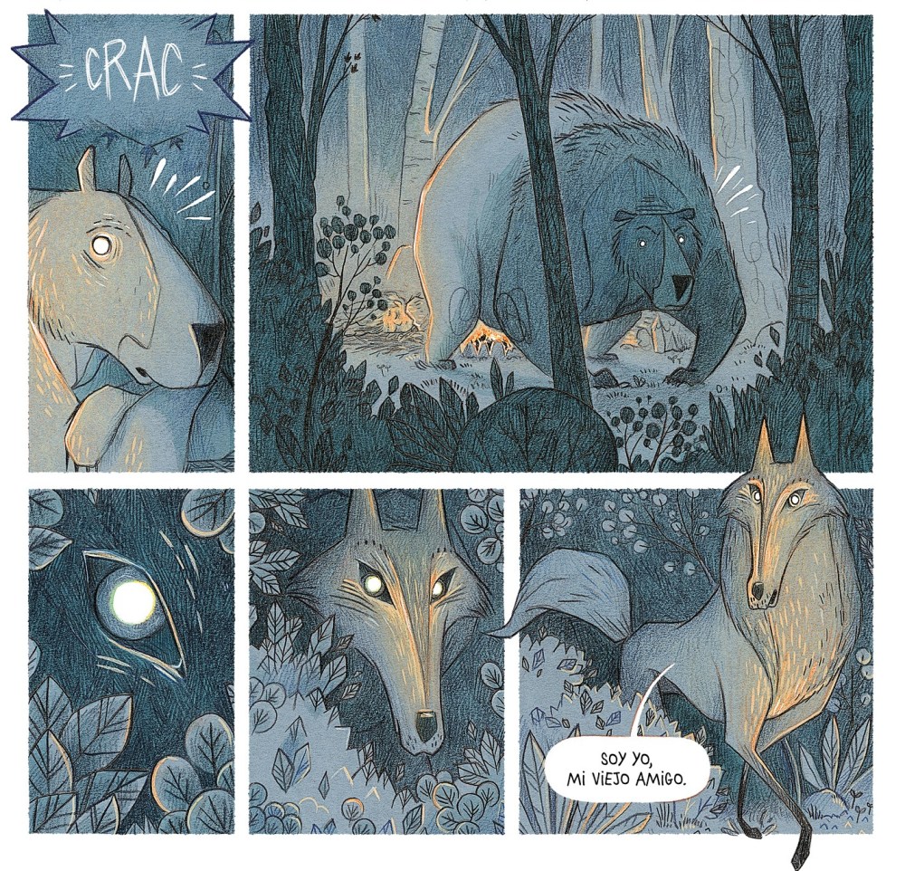 Ah, los dibujos. Léa Mazé no ilustra, pinta emociones con ramas y atardeceres. Su estilo tiene algo de geométrico, sí, pero está lleno de vida. Cada viñeta es un soplo de aire fresco. Los tonos otoñales, el azul profundo del pelaje del oso, los destellos dorados entre las ramas, el silencio del bosque, el temblor de los ríos: todo habla. Y cuando los personajes corren, la página vibra. Cuando se detienen, el lector respira con ellos. Hay una magia en su trazo, un amor por lo orgánico, por lo animal y lo vegetal, que transforma el libro en un canto a la vida salvaje. Es como si estuviéramos leyendo una canción de cuna escrita por la propia Tierra.