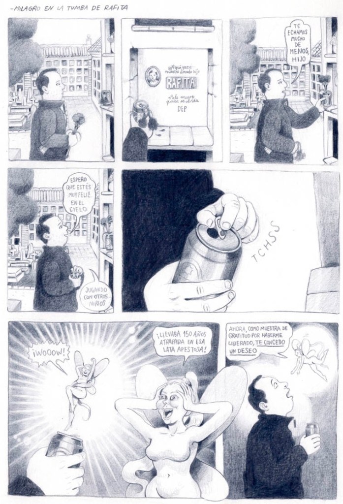 Junto al tema que da título al volumen conviven otros en su interior – como “Shojo 2005” donde Irene se aleja de su estilo habitual, que no de su lúcido ingenio – , mientras lo más salvaje puede aparecer en cualquier viñeta. En estas páginas no hay nada sagrado. En su lugar, queda plasmada una brava mala uva que despierta la carcajada. Entre el ingenio y la crueldad crece esta comedia negra, de forma cruda y certera. Donde la risa se conjuga con lo incómodo y desagradable. Donde se demuestra que, aunque sea un momento de máximo dolor, a veces aparece el absurdo más descabellado. O la resolución más brutalmente contundente. Que todo es posible cuando estamos ante un tebeo de Irene Márquez.