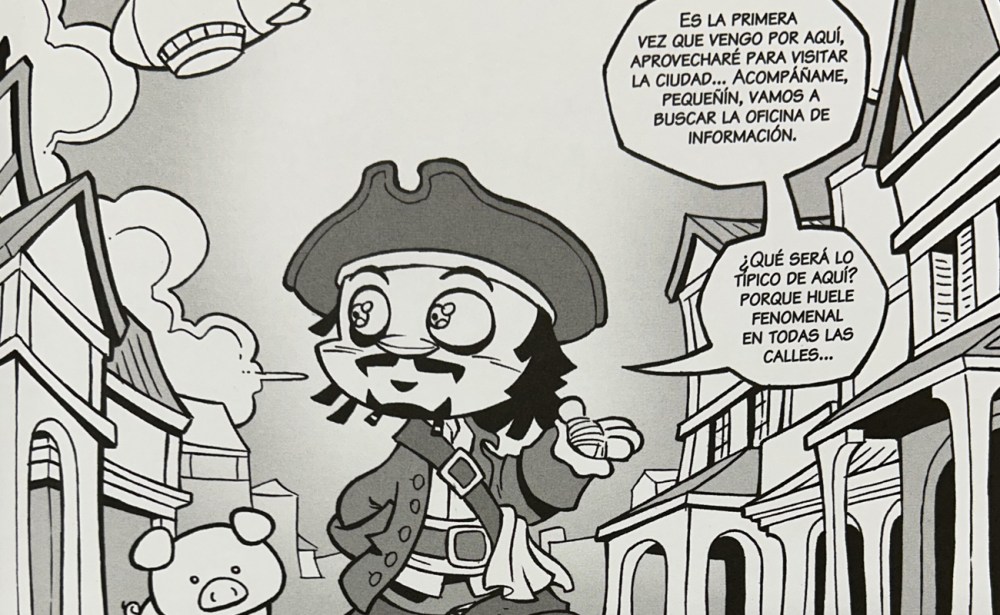 Visualmente, el cómic es puro Vegas: blanco y negro expresivo, personajes con cabezas gigantes y miradas que lo dicen todo (aunque lo que digan no tenga ningún sentido). La expresividad de las viñetas es tal que cada movimiento de espada, cada mueca, cada caída estúpida, parece coreografiada por un Bugs Bunny con entrenamiento ninja. No se trata solo de dibujar bien: se trata de que cada página sea un gag visual, un festival de detalles ocultos, un “¡espera, espera, eso no puede ser…!” que se repite constantemente porque, efectivamente, lo es: sí, ahí está Cary Elwes en su papel de pirata en la Princesa Prometida. Sí, ese que aparece en el fondo es Mickey Mouse. Sí, ese barril tiene ojos y está discutiendo con un loro. Todo eso y más está en estas páginas.