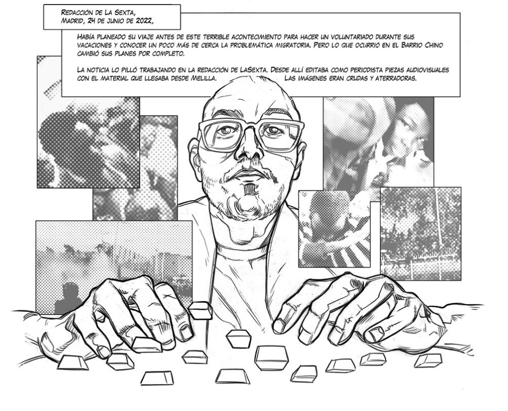 Pero esta novela gráfica se eleva cuando rompe el blanco y negro. Entonces, las páginas estallan en color. Y ahí entran cinco voces, cinco ilustradores que insuflan alma a los caídos. Cada uno de ellos aporta un universo visual diferente, una identidad estética que no solo complementa el relato, sino que lo transforma, lo convierte en homenaje, en ofrenda, en ritual de duelo y de memoria. Eusebio Nsue Nsue Asue, desde Guinea Ecuatorial, dibuja con una fuerza que recuerda te lleva al paso fronterizo de una patada. Sus trazos mezclan tradición y dolor, como si cada línea llevara grabada una herida histórica. En sus páginas uno siente el eco de generaciones desplazadas. Hay orgullo, pero también fragilidad. Sus colores no decoran: sangran. Por otro lado, Zainab Fasiki, desde Marruecos, da vida a Hanin, un joven cuya sonrisa, dicen, iluminaba el campamento. Su trazo, firme y elegante, hereda la tradición del cómic social, pero lo lleva más allá. Fasiki, rompe tabúes y ofrece un retrato íntimo, sutil, profundamente humano. Sus páginas son un susurro lleno de ternura, una forma de decir: “Hanin no era un número. Era un chico apuesto, generoso, con sueños y familia”. Y como siempre se evidencia que hay personas que valen mucho menos que otras y que su sufrimiento no importa más allá del paso fronterizo.