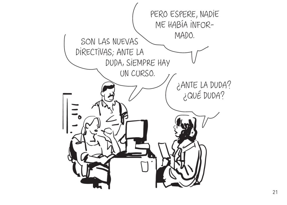 Desde la primera página, Vivès deja claro que esto no es una autobiografía al uso. Esta historia es suya, pero no es él exactamente. Es una versión de sí mismo, puesta en escena como personaje tragicómico que atraviesa situaciones delirantes: desde cursos de reeducación obligatoria en los que se sienta solo frente a un evaluador (“¿Cree que hay pocos pedófilos en Francia?” le preguntan con sarcasmo), hasta infiltrarse en una universidad para cazar a creadores de fanzines que dibujan contra Francia, pasando por una delirante escena en la que una delegación japonesa le propone exiliarse al país del manga con la promesa de que “allí no hay woke, puedes caminar tranquilo por la calle”. Esta forma de distorsionar la realidad hasta hacerla grotesca no es nueva en la obra de Vivès, pero aquí alcanza un punto de cocción especial. La representación de los hechos no busca la objetividad ni el desahogo, sino abrir las costuras del absurdo. El dibujo, en blanco y negro, apoya esta estética de lo inestable, de lo frágil, como si todo pudiera derrumbarse con un soplido.