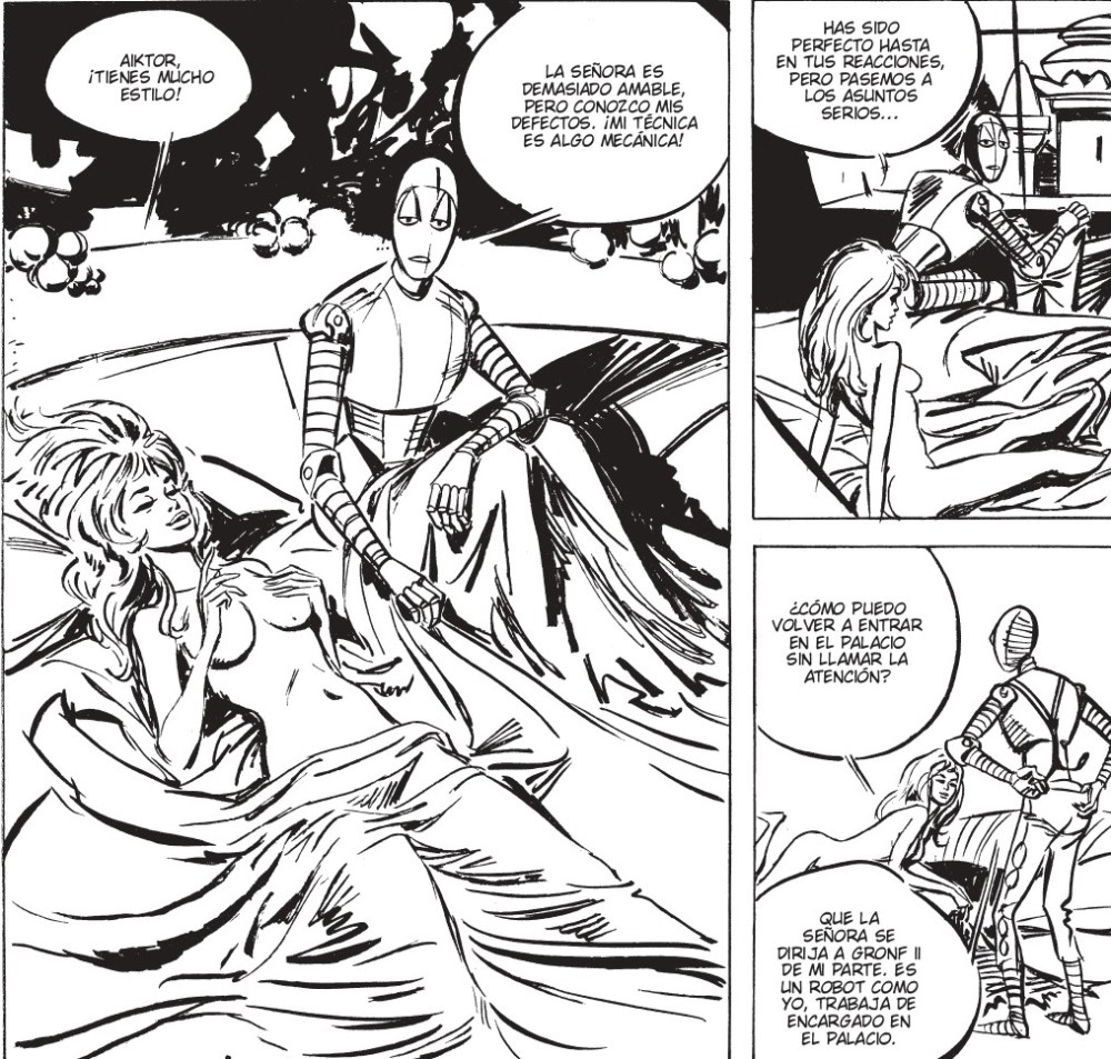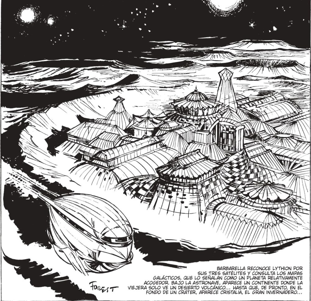 En lo gráfico, el dibujo de Forest acompaña esa joven rebeldía con un trazo ágil, sensual y dinámico. Aunque sus primeras páginas muestran cierto titubeo, pronto se asienta en un estilo que mezcla lo ligero con lo poético. Sus composiciones juegan con el blanco y negro de manera casi musical, dejando que la mirada del lector se deslice de una viñeta a otra como quien recorre un sueño. Los cuerpos, las naves, las criaturas y las ciudades flotan en un espacio gráfico donde lo surrealista y lo fantástico se abrazan sin complejos. Pocas obras logran mantener ese frescor, esa capacidad de maravillar, sin parecer reliquias polvorientas y siempre con ese tono erótico que nunca cae en lo vulgar.