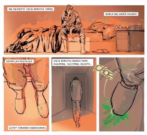 De ese punto de partida comienza un proceso Kafkiano que sirve para que Javier Gallego pueda ahondar en cuestiones de mayor calado como, por ejemplo, la soledad en la que viven muchas personas en las grandes ciudades, la salud mental, la falta de relaciones sociales o ausencia de redes de apoyo. Es en esa amalgama donde se asienta el cómic, plasmado de forma eficaz por Juan Gallego: el cual nos muestra en estas páginas una combinación de estilos gráficos que refuerzan cada uno de los pasajes del relato. Tanto en lo argumental como en lo emocional, el cómic se apoya en todas y cada una de las opciones estéticas que ha elegido el dibujante para, lejos de dispersar, intensificar el resultado global.