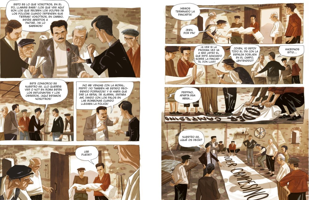 Por otra parte, la estructura del cómic es peculiar. Tras la historia ilustrada, de apenas 70 páginas, se incluye una sección con textos críticos escritos por Lirio Abbate, Marco Rizzo, y Francesco Barilli. que te sitúan perfectamente en los eventos que sucedieron en el tebeo. Junto a ellos, una entrevista realizada por Stefania Brusca al hermano de Peppino, Giovanni Impastato. Es un añadido valioso que aporta contexto y permite al lector comprender la magnitud del legado de Peppino. Sin embargo, también es aquí donde surge una de las debilidades de la obra: la parte gráfica se siente breve, casi esbozada. Momentos clave de la vida del activista aparecen de forma fragmentaria, y uno tiene la sensación de que el relato pide más páginas para respirar, para desarrollar a fondo los conflictos, las alianzas y las pequeñas victorias que hicieron de Peppino un símbolo.