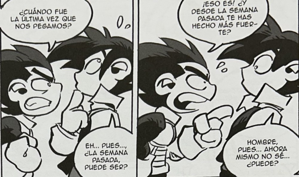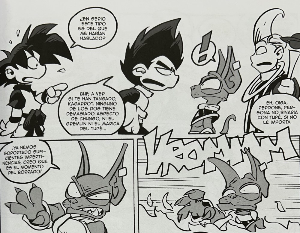 Por otro lado, la magia de los combates es maravillosa. En Dragon Ball son épicos, interminables y con explosiones cada dos páginas. En Dragon Fall son como peleas de borrachos a la salida de un bar. Sosón lanza un ataque más cercano a un loco que a un super guerrero. Bilis usa una frase muy conocida por todos los que manejan un ordenador. Al final acaban reventando medio planeta porque nadie sabe lo que está haciendo. La violencia existe, claro, pero está narrada con tanto humor cafre que más que tensión lo que provoca son carcajadas.
