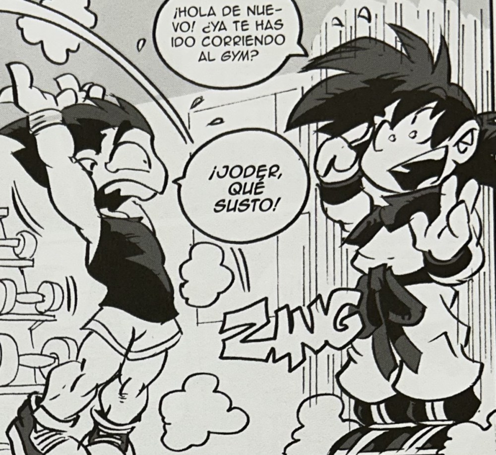 «Dragon Fall Returns» no es solo una vuelta. Es un regreso en modo Super Saiyajin. Nacho coge la saga de La batalla de los dioses. La famosa introducción de «Dragon Ball Super«, y la convierte en un festival de disparates donde nada ni nadie está a salvo. Ni Goku (perdón, Sosón Goku), ni Vegeta (perdón, Vegetal), ni Chichi (Chicha en estas páginas). Ni el pobre Bills (en este caso Bilis), que en lugar de ser un dios de la destrucción parece el gato de tu vecina después de comer hierba gatera adulterada. Uno de los puntazos es que Nacho no se limita a repetir las bromas de antaño. Ahora se ríe de todo lo que se le pone por delante, desde los criptobros hasta el ataque de los titanes. Pasando por cameos imposibles como la América Chávez de Marvel, que aparece perdida como si hubiera entrado por error en el manga equivocado. Y lo mejor es que no se siente forzado. Son esos guiños que pillas al vuelo, que te hacen decir “¡anda, mira quién ha venido a la fiesta!” mientras piensas que este cómic no es tanto un homenaje a Dragon Ball como un homenaje a la cultura pop pasada por el filtro del humor gamberro.