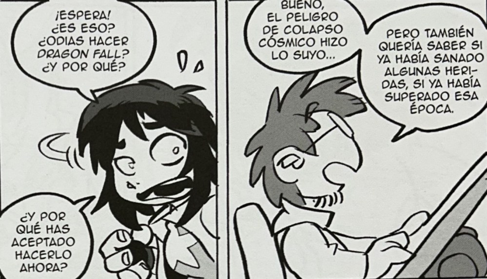 El dibujo de Nacho Fernández es otro de los grandes ganchos. Su estilo caricaturesco exagera al máximo todo. Los músculos parecen globos hinchados, las expresiones faciales son puro meme. Las peleas tienen un dinamismo que, en lugar de imponerte respeto, te arranca risas. Es la mezcla perfecta entre homenaje y cachondeo. Reconoces a los personajes. Reconoces las escenas, pero todo está tan deformado, tan pasado de vueltas, que parece un fanzine hecho con esteroides y buen humor. Además, hay un puntazo meta que Nacho maneja como pocos. Los personajes son conscientes de que están en una parodia. Incluido el propio Nacho, junto con el cocreador de la saga, Álvaro López. América Chávez pregunta de vez en cuando si el guion se está improvisando. Se queja de que si sabe lo que se está creando para ordenar el universo. Vamos un complot perfecto para que cualquiera que pase por estas paginas no se aburra en ningún momento. Algo que nunca falta en esta historia es el humor bestia. Ese que te hace reír y pensar “no debería estarme riendo de esto, pero me estoy descojonando”. Chistes guarros, insultos creativos, referencias sexuales veladas (y otras no tan veladas), y un espíritu macarra que recuerda que Dragon Fall nunca fue para niños, sino para adolescentes con ganas de reírse de todo lo sagrado.