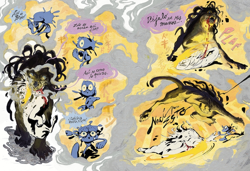 El relato crece así, a paso firme. Fortalecido por un guion que destila un exorcismo tan emocional como surrealista. Donde lo barroco y lo poético se encuentran y producen pasajes que más que mostrar hacen sentir. Para ello, Natalia Velarde, despliega constantemente un magnetismo plástico notable. Jugando con la forma, maximizando todo lo que puede dar de si las composiciones de página: jugando con la disposición de los elementos, rompiendo la estructura clásica de la viñeta y potenciando, en todo caso, una narrativa gráfica que, más que solvente, es imponente por la gran efectividad que despliega, pues guía al lector de forma inequívoca por este delicioso viaje. Tan lisérgico como íntimo; y a su vez espectacular por los recursos gráficos que la autora emplea.