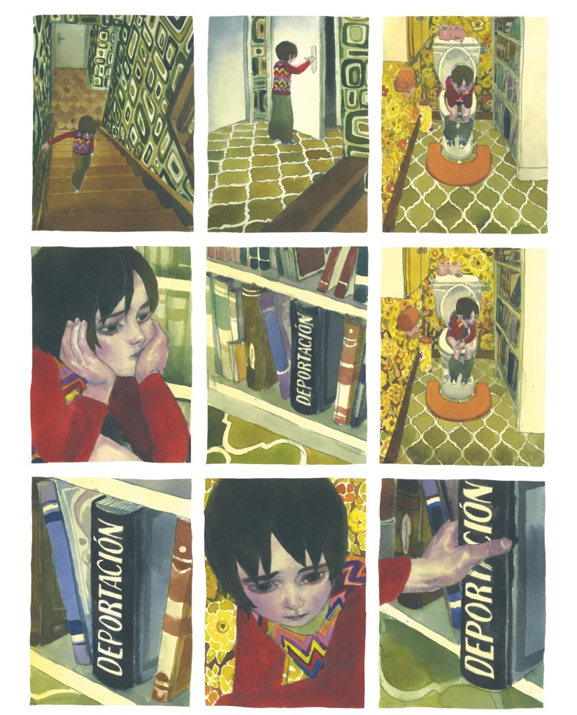 Las escenas de infancia están teñidas de luz hasta cierto momento que todo cambia. Aquí, el trazo de Sala se llena de colores vibrantes. Como si la memoria quisiera suavizar el impacto de los relatos. Son páginas que respiran calidez, humor y ternura. Pero a medida que crece, la luz se apaga. La historia avanza hacia los recuerdos más oscuros. En estas páginas, el estilo cambia de forma radical. Sala abandona el realismo y se adentra en un expresionismo inquietante. Con figuras distorsionadas, colores apagados y composiciones que transmiten opresión. Aquí, el arte no embellece: incomoda, duele y golpea. Sin embargo, incluso en esos momentos, hay destellos de iluminación. Esta alternancia entre luz y sombra, entre ternura y horror, no es casual. Es el corazón mismo del cómic. La vida de estos hombres no puede resumirse solo en tragedia o solo en heroísmo, sino en la mezcla compleja de ambas. Sala consigue que cada plano familiar, histórico u onírico tenga el mismo peso. Incluso las partes más ligeras, como el pequeño protagonista descubre el cómic como medio de expresión