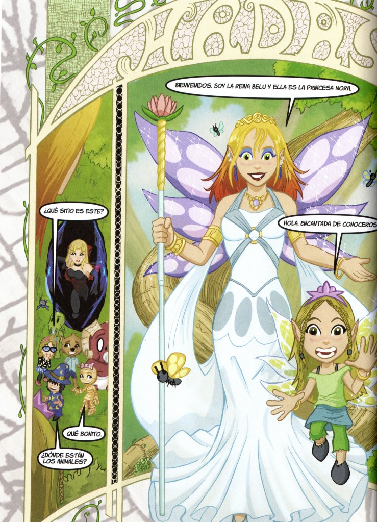 El asunto no se queda ahí. La historia se complica, se ramifica y se abre hacia un mundo de hadas, en el que los niños descubren a la mismísima reina de las hadas. Este encuentro cambia las reglas del juego y convierte el cómic en una especie de excursión a otro plano, lleno de criaturas, paisajes y situaciones que tienen mucho de cuento clásico. El mundo feérico que Enebral construye no es un decorado bonito sin más. Tiene textura, historia y está lleno de rincones que piden ser explorados con calma. Y aquí es donde entra en juego el trabajo visual: cada página está cargada de detalles, relieves y elementos gráficos que convierten la lectura en una experiencia casi táctil.