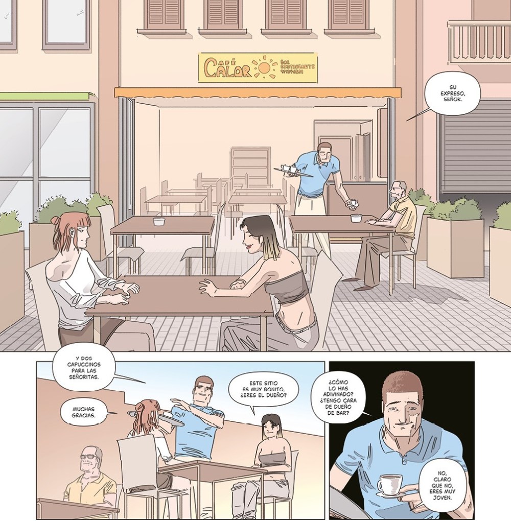 En cuanto a la trama, Bauzá opta por la economía de medios. No hay exceso de texto ni explicaciones redundantes. Los diálogos son secos, realistas, con silencios que dicen tanto o más que las palabras. Ese minimalismo refuerza la sensación de realismo, porque la vida cotidiana rara vez se explica a sí misma. El lector, como el propio protagonista, debe aprender a leer entre líneas, a interpretar las miradas y las insinuaciones. Lo que comienza como una trama policial termina siendo un dilema ético: ¿hasta dónde puede llegar un hombre honrado en su lucha por la justicia sin perderse a sí mismo? Esa es la pregunta que sobrevuela toda la obra, y la que la convierte en algo más que un simple thriller. Café Calor no ofrece respuestas fáciles ni finales edulcorados. En su lugar, propone un espejo incómodo en el que el lector debe reconocerse. Estamos ante un autor con una voz propia, capaz de combinar una mirada crítica con un pulso narrativo firme. No es sencillo condensar una historia tan cargada de subtexto en apenas medio centenar de páginas, pero Bauzá lo logra con solvencia, sin dejar sensación de vacío ni de precipitación. Cada viñeta cuenta, cada escena empuja hacia adelante.
