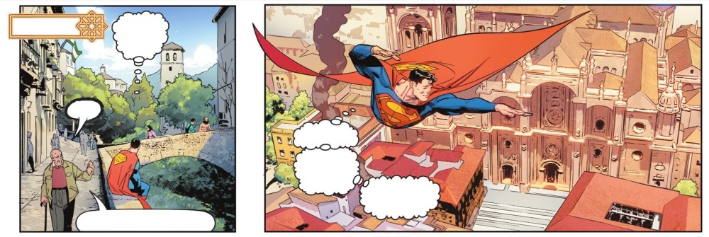 Entre tanto y bueno que hay en el volumen, cabe destacar la aportación española por fresca, solvente y, por que no decirlo, entrañable. Nos referimos a “Superman en Granada”, de Jorge Jiménez y Alejandro Sánchez, que hemos reservado para el final de este análisis. Un relato breve en el las riendas son asumidas por el artista granadino, uno de los habituales que ha dibujado a Superman en los últimos años, además de a Batman y a los hijos de ambos (en la serie más fresca del rebirth de DC de la pasada década : “Superhijos” (“Supersons”)). Jiménez aprovecha la ocasión para llevar al primer superhéroe a su ciudad, Granada. Y lo hace con desparpajo y frescura, en una historia breve y divertida, en el que lo heroico convive con situaciones más terrenales, mientras se nos pasea por algunos de los lugares más emblemáticos de “Graná”. Queda así una historieta amable, pero sólida, en la que los que hemos tenido la suerte de recorrer las calles de la ciudad andaluza y sus monumentos la reconocemos en las viñetas. Unas que se intuye guionizadas y dibujadas con cariño y mimo por Jiménez y coloreadas por un efectivo Alejandro Sánchez, en la que lo fantástico y lo real maridan a la perfección en un canto de amor tanto al personaje como a una de las ciudades más bellas de la península ibérica.