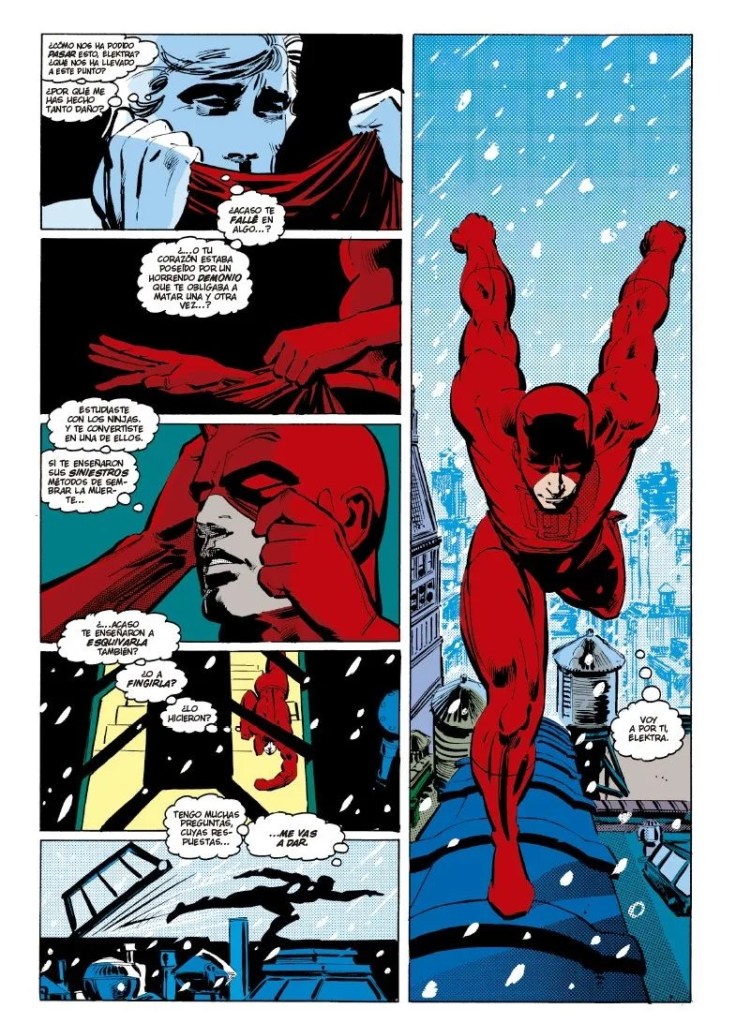 Hablar de Daredevil en los años ochenta es hablar de un cambio de paradigma en el cómic de superhéroes. El personaje, que durante mucho tiempo había estado en la periferia del universo Marvel era considerado como un secundario de lujo sin el impacto icónico de Spider-Man. Sin embargo, encontró en la figura de Frank Miller a su verdadero demiurgo. Eso está recogido a lo largo de los tomos de esta colección de Panini, que aglutina la etapa esencial de Frank Miller y Klaus Janson. Donde hemos asistido a la conversión de un héroe menor en una figura trágica, adulta y cargada de matices. Y en este cuarto y último volumen es donde el viaje alcanza su clímax y se cierra un ciclo que marcó para siempre la historia del cómic de superhéroes.