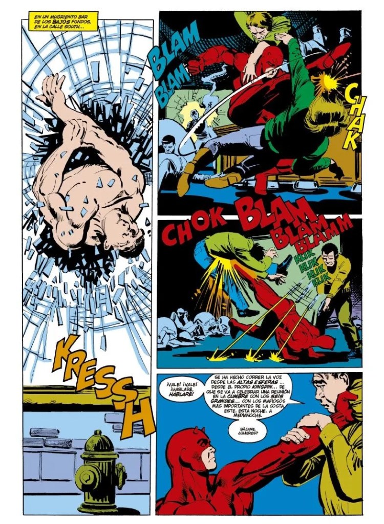 En el aspecto gráfico, este tomo es fundamental porque muestra la transición de Miller hacia un estilo más libre y experimental. Sus lápices son más sueltos, sus encuadres más atrevidos y sus composiciones más arriesgadas. El trabajo de Klaus Janson como entintador es decisivo para dar cohesión a este estilo emergente. Lo que vemos aquí es un cómic que empieza a parecerse a una película en viñetas. Las sombras se alargan, las perspectivas se distorsionan, los callejones se llenan de tensión. Se siente que estamos asistiendo al nacimiento de un autor que redefiniría el cómic americano.