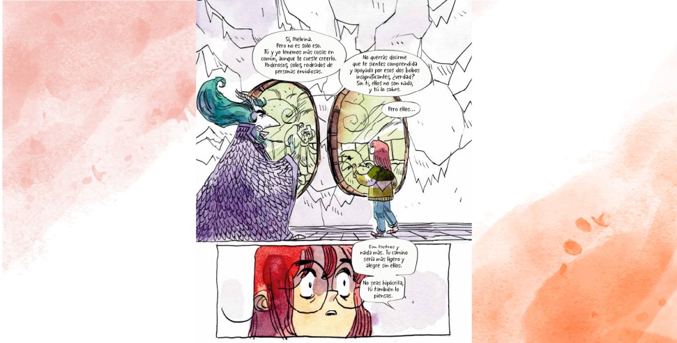 Por otra parte, el contraste entre el mundo real y el de Masacá funciona como un espejo mágico de las tensiones internas de Melvina. En un lado, están los problemas escolares, los comentarios hirientes, la sensación de no encajar. Por otro, el retorno a un reino de fantasía donde sus amigos Otto y Benjamín siguen esperando, leales pero heridos por su ausencia. Ese reencuentro no es menor. La amistad, a estas edades, se convierte en una brújula. La autora lo trata con una delicadeza que conmueve. Otto y Benjamín son recordatorios vivos de que crecer no significa dejar atrás a quienes te acompañaron en tu infancia, aunque a veces uno lo olvide. No hay que olvidar que la adolescencia, más allá de la literatura, es un terreno pantanoso y a menudo cruel. Aragno lo sabe y no lo esquiva. Nuestra protagonista experimenta esa mezcla de rabia y melancolía que tantas veces acompaña a los cambios de la pubertad. La incomodidad con el propio cuerpo, los trastornos alimenticios que acechan silenciosos, el miedo al rechazo. Lo hace sin caer en moralejas pesadas ni en discursos clínicos. Lo cuenta a través de símbolos, de miradas, de silencios entre viñetas que pesan más que un diálogo entero. Ese es quizá el mayor regalo del comic: la capacidad de traducir emociones invisibles en imágenes palpables.