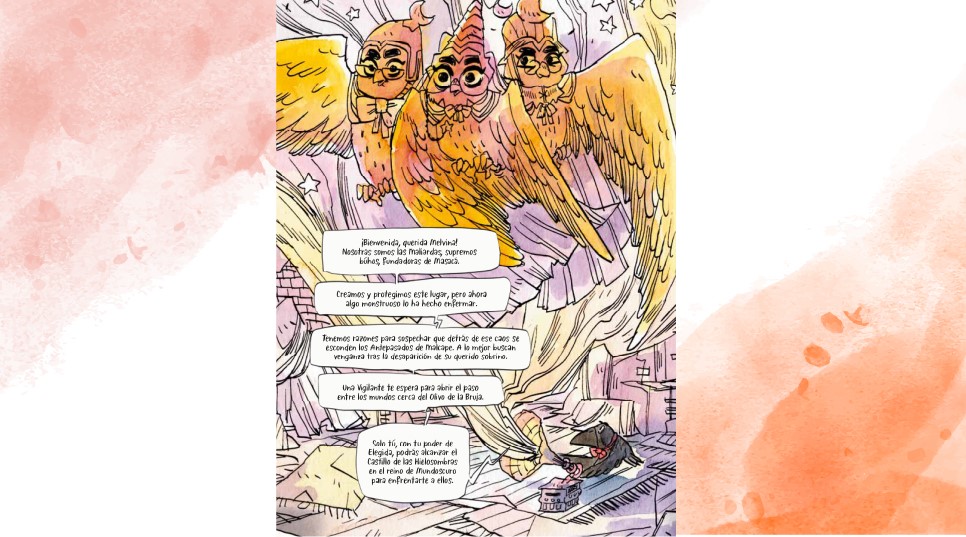 Hablemos de Melvina, la protagonista. Ya no es la niña intrépida y directa de la primera aventura. Ahora se ha convertido en una adolescente que duda, que tropieza con la incomodidad de sentirse rara frente a sus compañeros de clase, que empieza a notar cómo las amistades cambian, cómo la identidad se vuelve un espejo deformante. Ese detalle es fundamental: la vulnerabilidad. Aragno sabe retratarla con honestidad, sin edulcorarla ni convertirla en drama gratuito. Es el retrato de una chica que, como muchas personas, descubre que crecer duele. Que el aislamiento acecha y que no siempre sabemos cómo gestionar lo que sentimos. Y en ese preciso momento de fragilidad es cuando suena la llamada de Masacá. Ese mundo mágico que conocimos en la primera parte no aparece aquí como un simple refugio escapista, sino como una prueba de fuego. El regreso no es un premio es un desafío. Porque lo que parecía un reencuentro con la felicidad infantil es, en realidad, un espejismo tejido con intenciones oscuras. Malcape, ese villano que había sido derrotado, no se resigna al olvido y prepara su revancha con el sigilo venenoso de una serpiente. Aquí es donde el título cobra todo su sentido. Los secretos y las serpientes comparten naturaleza, ambos se arrastran entre sombras y esperan el momento adecuado para morder.