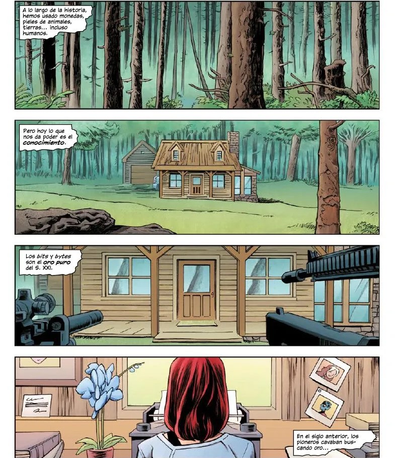 Uno de los mayores aciertos del tomo es el modo en que Shalvey presenta la relación entre Raven y Destino. Sí, no ocupa todo lo que podría, y más de uno se queda con las ganas de más besos, más diálogos íntimos, más conspiraciones de pareja inmortal. Lo que aparece es lo bastante fuerte como para recordar por qué estas dos mutantes son una de las duplas más queridas del universo de la Patrulla-X. Su amor es extraño, retorcido, condenado por visiones de futuros imposibles, pero inquebrantable. Raven quiere borrarse del mapa, desaparecer de toda base de datos, solo para proteger a Irene y a los suyos. Que el plan consista en hackear a S.H.I.E.L.D. a balazos y suplantaciones es secundario. Lo importante es que la villana que podría incendiar el mundo entero se sacrifica por las personas que ama. Oscuro, sí; pero conmovedor.