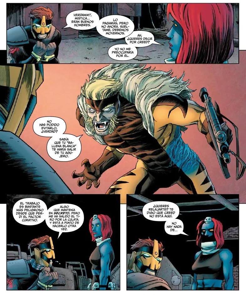 Claro que no todo es perfecto en estas 128 páginas. La trama de ese supuesto misterio central que debería enganchar al lector, queda difusa y casi olvidable. Uno termina el relato y lo que recuerda no es la conspiración internacional, sino las metamorfosis viscosas de Raven, las pullas de Furia y los silencios cargados entre ella e Irene. Quizá eso sea lo bueno. Cuando el adorno se desvanece, lo que queda es el corazón de Mística latiendo fuerte, contradictorio y peligrosamente humano. Al cerrar este tomo queda claro que Mística no es un personaje que se lea. Es un personaje que se padece, que se disfruta con culpa, que se escapa de las manos como arena teñida de sangre azul.