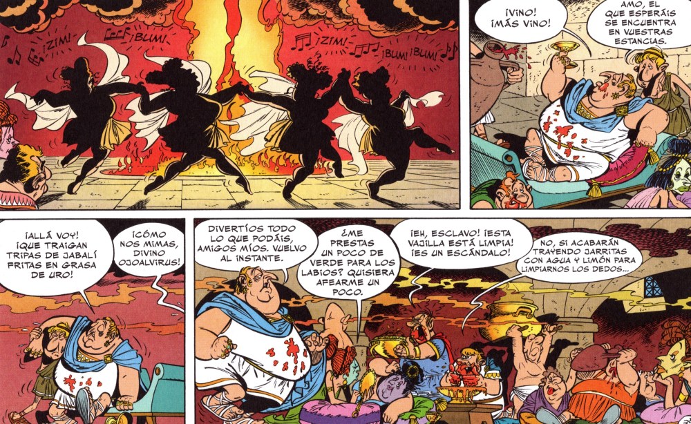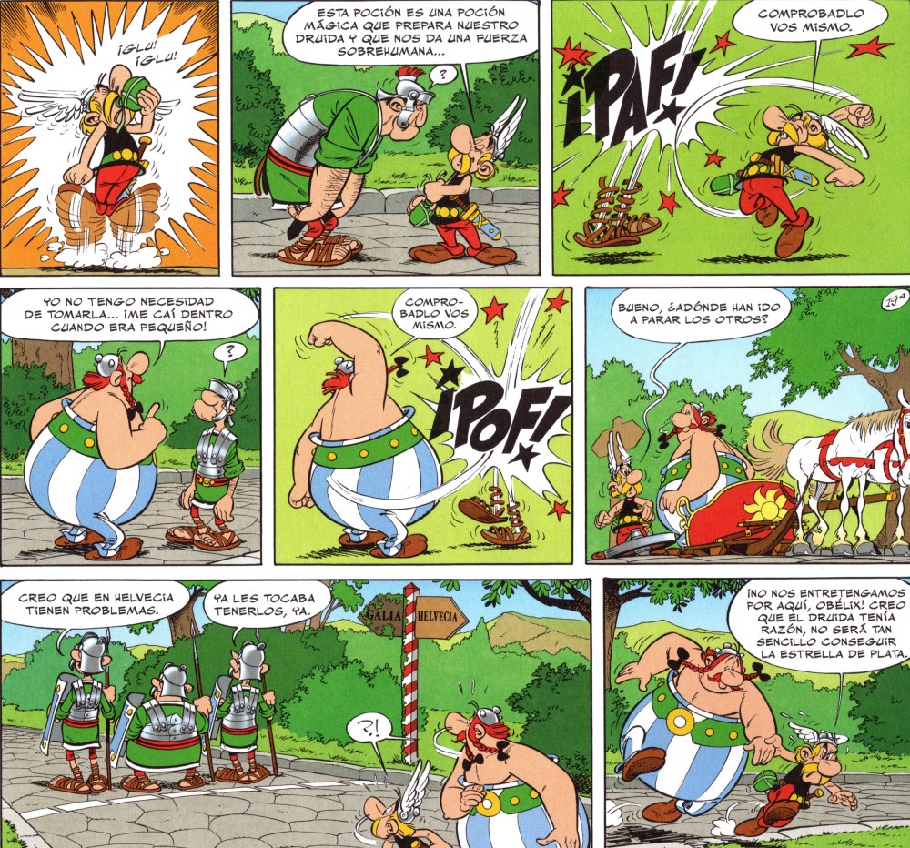 Si hay algo que encanta en los álbumes de viajes de Astérix es ver cómo nuestros héroes se enfrentan a culturas que no entienden y que, de paso, se ríen de sí mismos. Aquí, los dos galos llegan con su mochila de tópicos. El dueño de Ideáfix solo piensa en comer y nuestro irreductible de bigotes dorados intenta mantener el control. Pero claro, los helvecios no son precisamente un público fácil. En Ginebra, nuestros queridos galos descubren que la banca helvética ya era impenetrable en la Antigüedad, y que, si querías guardar algo en secreto, lo suyo era meterlo en una caja fuerte suiza. Goscinny aprovecha para clavar una sátira política y económica que, décadas después, sigue siendo de rabiosa actualidad. ¿Quién no ha oído hablar del secretismo de los bancos suizos? Pues ahí lo tenéis: convertido en chiste en plena BD de los 70. Por supuesto, no podía faltar el queso con agujeros. Uderzo lo dibuja con un cariño especial, casi como si fuera un personaje más. Obélix, que normalmente se devora los jabalíes como si fueran pipas, se enfrenta aquí al reto de un plato que no entiende. Porque claro, ¿cómo puedes comerte algo que está lleno de agujeros? Nadie entiende como puede gustarles tanto el queso en ese país.