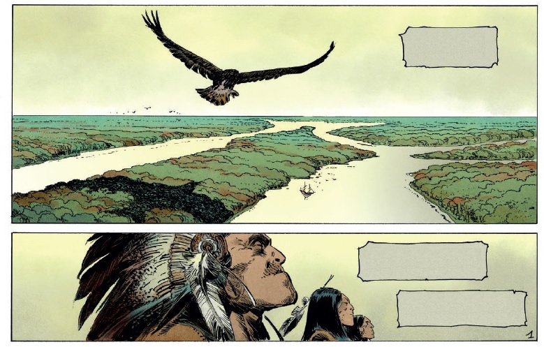 Ya la portada a cargo de Mathieu Lauffray sintetiza a la perfección lo que espera en su interior: la imagen poderosa de un indio norteamericano sobre la sombra de un cowboy define a la perfección el subtítulo del volumen: “La sombra negra del hombre blanco”. Pues esta fue definitiva para aquellos pueblos orgullosos que estaban en pleno contacto con la naturaleza y tomaban de ella solo lo que necesitaban. En contraste, la civilización que llegó explotó los recursos de la tierra en aras del progreso. Sirva de ejemplo, la fiebre del oro que fue desplazando a los indios hacia las tierras donde no había yacimientos, mientras que los recursos de los que vivían fueron mermando a consecuencia de la huella del hombre “civilizado”. Condenados a vivir en reservas, y corrompida su conexión espiritual con su medio ambiente, la suerte de aquellos amerindios es de todos conocida.