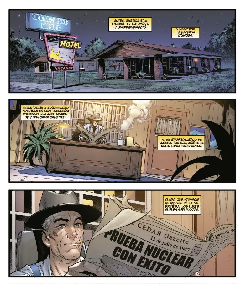 En paralelo, Reed Richards y Sue Storm intentan reconstruir algo parecido a un hogar en medio de la ciudad destruida. Sus capítulos respiran una melancolía particular. Vemos a Reed, el eterno hombre de ciencia, enfrentado a un mundo de relojes rotos y realidades fracturadas. A Sue, que como siempre es el ancla de la familia, sosteniendo con calma lo que parece insostenible. Es fascinante cómo North convierte la ciencia ficción en una metáfora de la vida cotidiana. El matrimonio como un rompecabezas en el que las piezas no siempre encajan, el tiempo que se quiebra como los relojes que ya no marcan las horas, la necesidad de seguir adelante incluso cuando todo parece perdido.