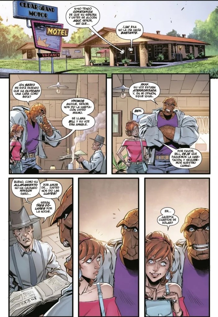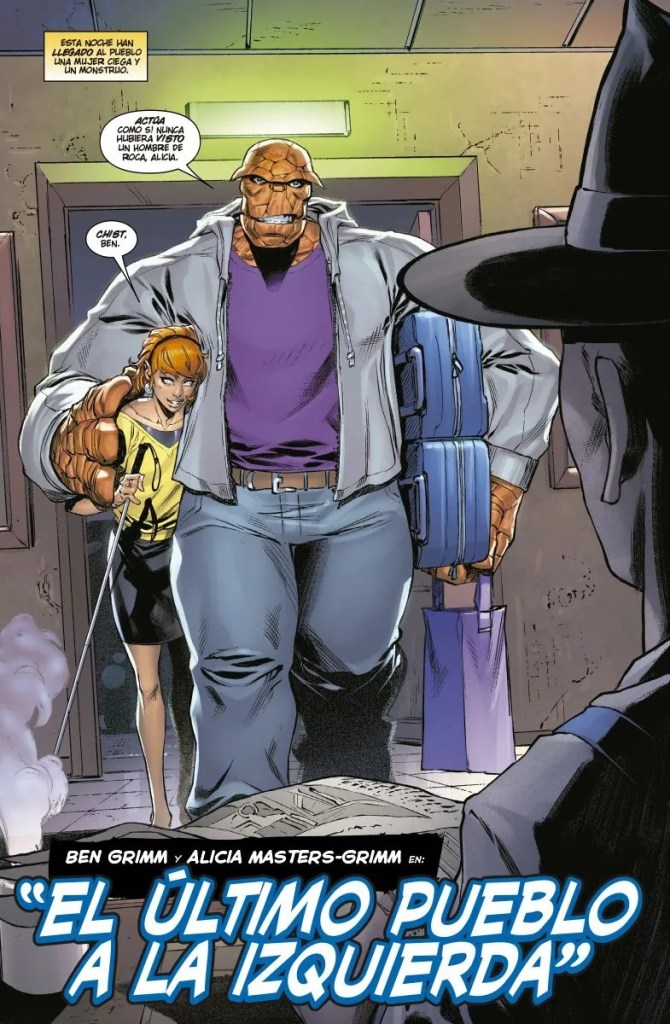El arranque con Ben Grimm y Alicia Masters es toda una declaración de intenciones. Lejos de los rascacielos y de la Torre Baxter, el matrimonio viaja por carretera, casi como si fueran fugitivos de su propia vida. Pero ese viaje pronto se transforma en un descenso a lo extraño cuando ambos se ven atrapados en un bucle temporal que no solo repite los días, sino que parece haber estado allí desde antes de que nacieran. Ryan North utiliza esta paradoja como un espejo de lo que significa vivir anclado al pasado, de lo que implica que la vida se repita sin salida aparente. El tiempo se convierte en un personaje más, un antagonista invisible pero implacable, y tanto Ben como Alicia deben enfrentarse a la pregunta de si se resignan a girar en ese ciclo eterno o si encuentran la manera de romperlo. No es una batalla con puños o con poderes, es una lucha contra lo inevitable, y ahí late con fuerza la verdadera identidad de los 4 Fantásticos: no son solo superhéroes que salvan mundos, son personas que no se rinden ni siquiera cuando el enemigo es la misma lógica del universo.