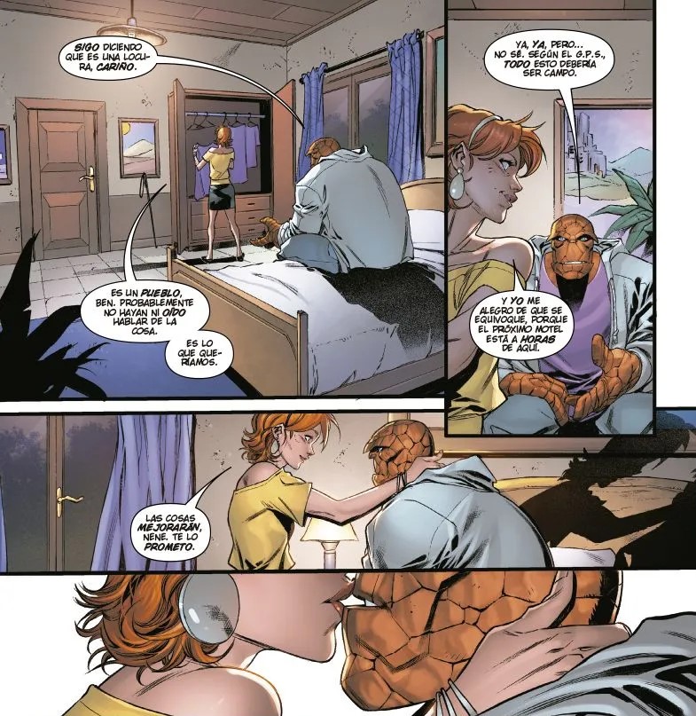Por su parte, Johnny Storm vive quizás el viaje más íntimo. La Antorcha Humana, siempre arrogante, siempre bromista, aparece aquí más vulnerable que nunca, intentando construir una identidad en una ciudad que lo rechaza. Busca su lugar en un presente que se le escapa entre los dedos. Johnny siempre fue el eterno adolescente del grupo, pero en estas páginas se revela como un hombre que, pese a las llamas que lo envuelven, teme quedarse solo. Esa vulnerabilidad lo convierte en un personaje más humano que nunca, alguien con quien cualquiera puede identificarse.