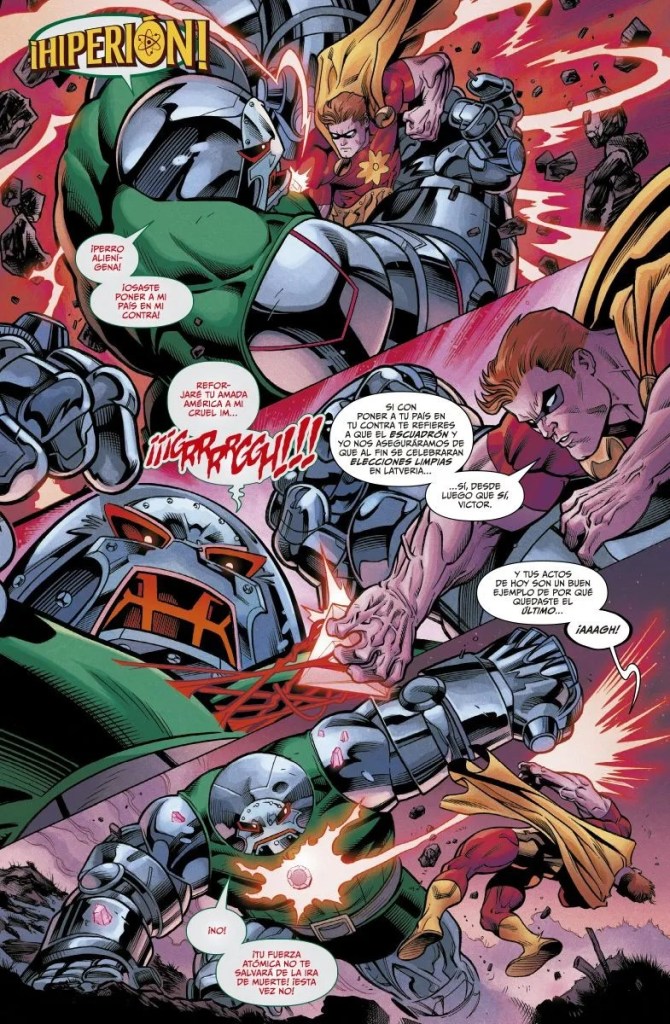 Lo interesante de este Heroes Reborn es cómo juega con la nostalgia y la comparación inevitable. El Escuadrón Supremo parece perfecto, sus victorias son limpias, sus gestos son nobles y sin embargo notamos que falta algo esencial. Porque los Vengadores no son perfectos, nunca lo fueron, y ahí está precisamente su fuerza. Son un grupo de egos enfrentados, de personalidades disfuncionales, de héroes que discuten más de lo que actúan, pero que al final del día logran lo que los demás no pueden: salvar el mundo con una mezcla de improvisación y coraje. El contraste entre la perfección artificial del Escuadrón y la caótica humanidad de los Vengadores es el verdadero corazón de este evento, y Aaron lo aprovecha para lanzar dardos a la propia esencia del cómic superheroico.