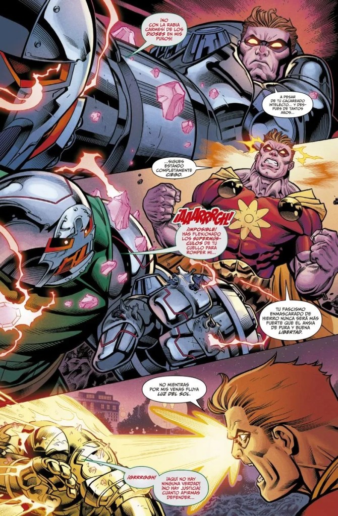 Cuando la historia llega a Heroes Return, el clímax se siente como un vaso de agua lanzado sobre una hoguera. El mundo alternativo estalla, la ilusión perfecta se resquebraja y los verdaderos Vengadores vuelven a reclamar su lugar. Es el momento en que todo el artificio se viene abajo y donde Aaron puede desplegar su afición por la épica desmesurada. El choque entre los Vengadores y el Escuadrón Supremo es tan brutal como prometido. El guionista no desaprovecha la ocasión para entregar escenas que parecen diseñadas para gritar “¡más grande, más fuerte, más espectacular!”. El regreso no solo cierra el círculo de la historia, sino que recuerda por qué los Vengadores son necesarios. Porque nadie más puede sostener sobre sus hombros un universo que tiende constantemente al caos.