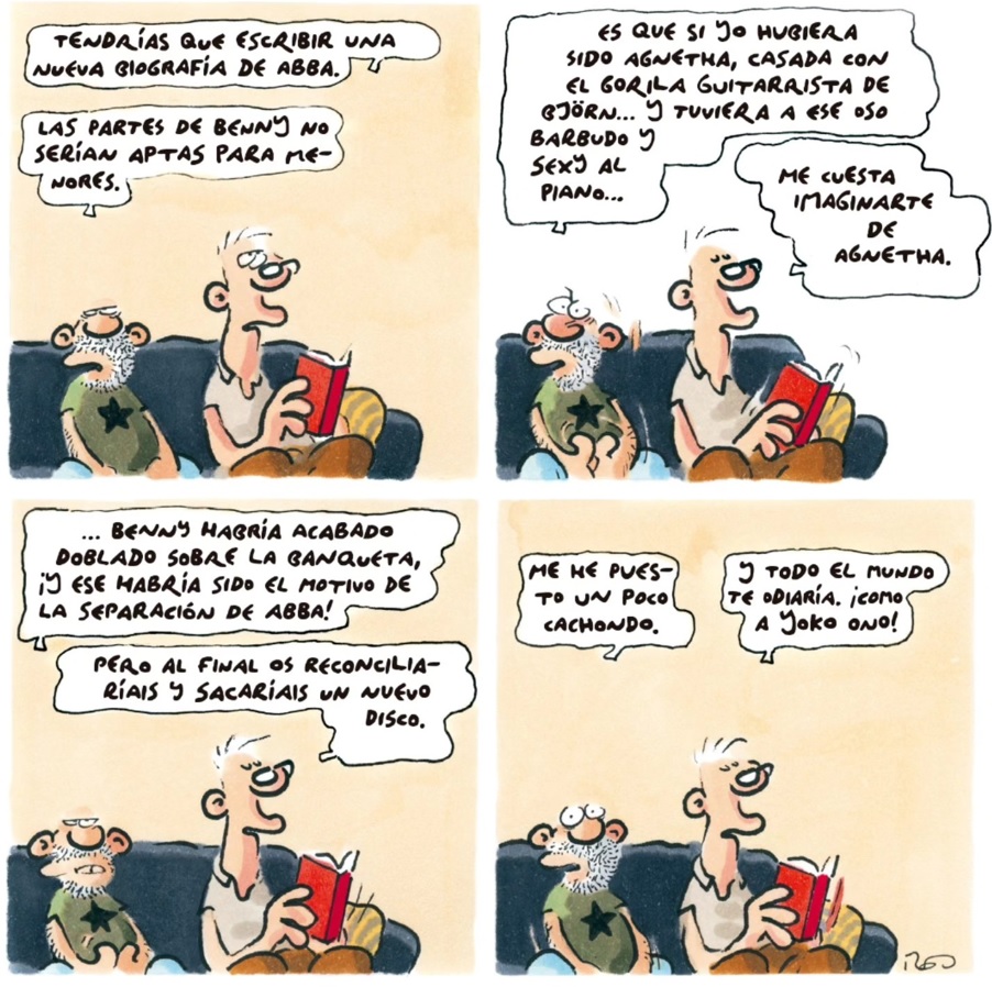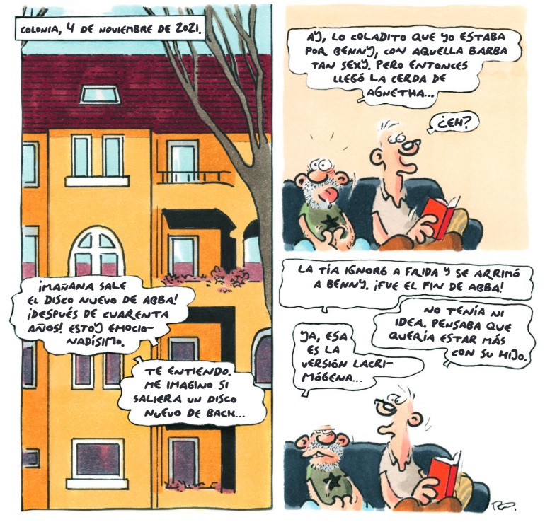 “Konrad y Paul están de vuelta”. Ese es el antetítulo que acompaña a “Mamma Mia!” ( “ABBA Hallo”) el nuevo tebeo de König que acaba de publicar La Cúpula. Con eso está dicho todo: Aquí están las últimas peripecias de esta pareja gay madura. En plena época pandémica y con una crisis de pareja. Justo cuando ABBA sacó su inesperado último disco. Todo bajo la convivencia de los dos personajes principales, tan diferentes como complementarios. Hecho que siempre le ha sacado un gran partido König y lo sigue haciendo.