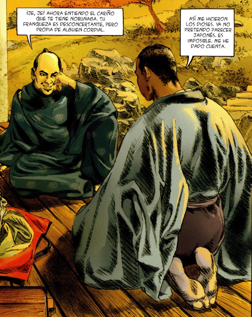 Kuro-san(nombre que le otorgaron los japoneses) ha alcanzado una posición única. Ya no es el extranjero al que todos miran con sospecha, ni el siervo que debe obedecer sin rechistar. Ahora comanda hombres, es protegido de Oda Nobunaga y esposo de Mariko, la hija adoptiva del daimyo. Ha saboreado el éxito y el respeto, algo casi impensable para alguien de su origen en la rígida sociedad nipona del siglo XVI. Pero este ascenso fulgurante tiene un precio, y este tomo se encarga de mostrarlo con crudeza y belleza. Porque la cima no es un lugar para descansar; es un campo de batalla distinto, más sutil y más cruel.