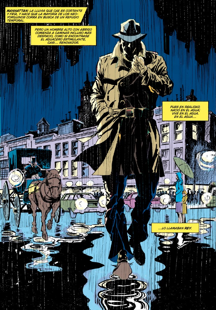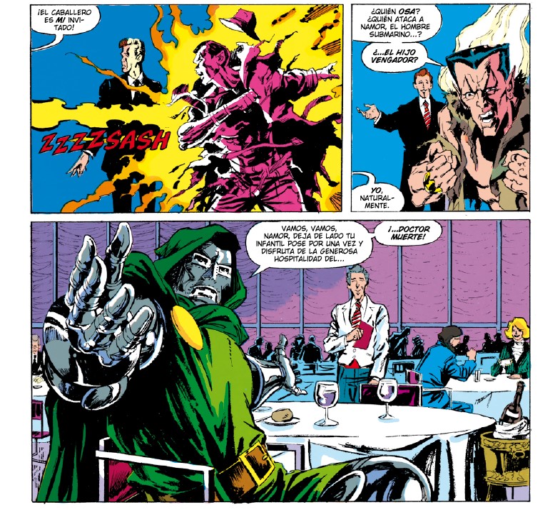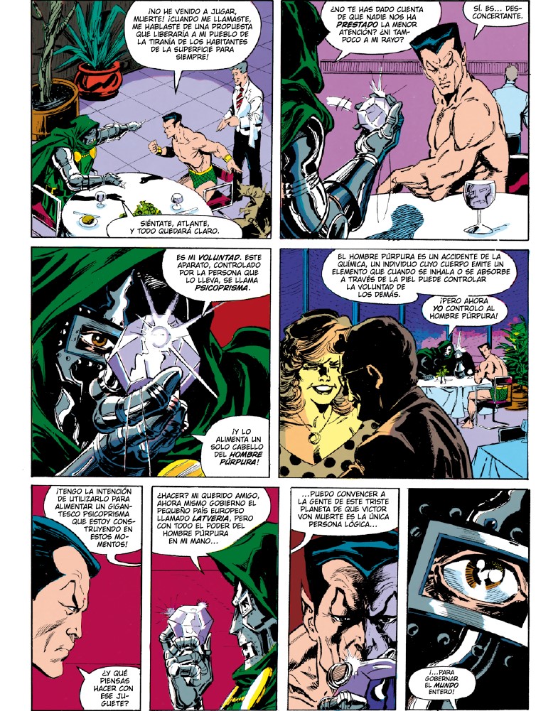 Bob Hall se encarga de todo el apartado gráfico (lápiz, tinta y color) y lo hace con una mezcla curiosa de clasicismo y expresionismo. Su línea recuerda a Neal Adams, pero de vez en cuando se ensucia, se retuerce y casi roza un estilo roto, especialmente en las escenas más psicológicas. Hay una viñeta icónica de Namor, con gabardina y sombrero bajo la lluvia, que parece sacada de la obra de Moore y Gibbons. El cómic oscila entre el tono superheroico tradicional y un intento de abordar temas más adultos, como si no terminara de decidir si quiere ser una aventura o una distopía política seria. Pero esa mezcla, lejos de ser un problema, le da una personalidad única. Emperador Muerte es un cómic de 1987 que quiere ser moderno sin perder su alma ochentera, y eso lo vuelve encantador. Además, funciona como un compendio perfecto de todo lo que define a Muerte. Su intelecto descomunal, su ego inquebrantable, su tendencia a pactar con Namor para fines retorcidos, su teatralidad desbordante y, sobre todo, su necesidad obsesiva de demostrar que él tiene razón. No conquista el mundo por simple ansia de poder, sino para probar un punto. Si todos siguieran sus reglas, viviríamos en el paraíso. Y lo peor (o lo mejor) es que por un momento parece que tiene razón.