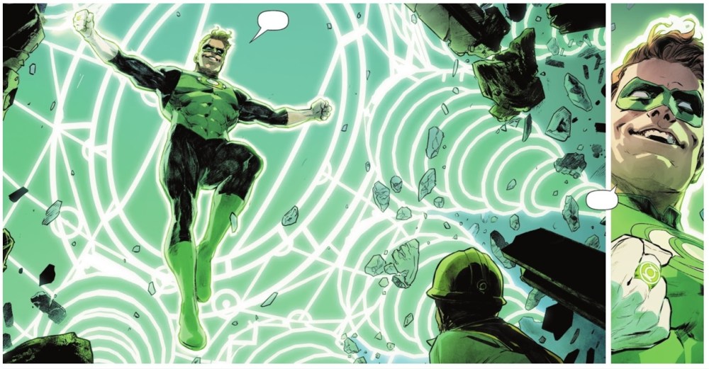 Más que un problema para Hal, será una oportunidad donde volverá a hacer gala de su fuerza de voluntad, pintada, como no podía ser de otra manera en el Universo DC, por el verde de los constructos que crea de su anillo. Una fuerza de voluntad marcada por el trazo de Xermánico, que brinda páginas cargadas de gran fuerza, aplicando el sentido de maravilla de ciencia ficción que implica un buen tebeo de Green Lantern, pero también cuidando rostros y encuadres en momentos de introspección. Consiguiendo así el equilibrio entre lo espectacular y lo íntimo que gráficamente “da acción” a las seis primeras entregas de la cabecera. Con la excepción de la última, que comparte el dibujo con Scott Godlewsky, el dibujo de todo el arco argumental es suyo, así con las portadas principales de la serie, volviendo a demostrar que su lapiz es uno de los que mejor entiende lo que implica la luz y el poder de Green Lantern. De idéntica manera que Romulo Fajardo Jr, que se revela como el socio ideal al color para tebeos de estas características.