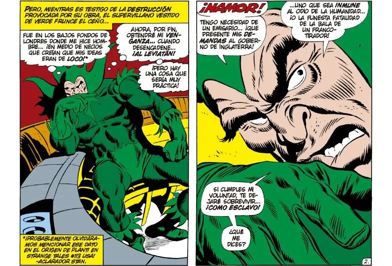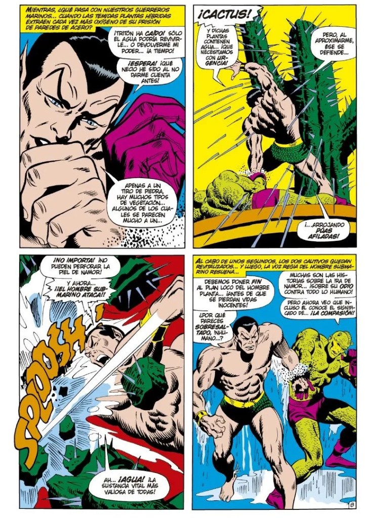 El tomo arranca con “En un día despejado puedes ver… ¡El Leviatán!”, continuación directa de la aventura previa del Hombre Planta. Thomas introduce en esta historia a Tritón, el miembro inhumano de la familia real de Attilan, que se convierte en un aliado ocasional de Namor. La unión entre ambos personajes funciona como una especie de espejo. Dos seres anfibios, orgullosos y nobles, atrapados entre el mundo humano y el marino. Tritón, con su aspecto exótico y su tono melancólico, refleja los dilemas de Namor y amplifica su tragedia. Visualmente, Buscema logra un equilibrio perfecto entre dinamismo y majestuosidad. Cada página parece tallada en coral, cada ola es una sinfonía de movimiento.