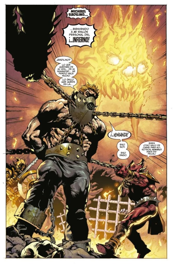 Desde la primera página, el cómic te grita en la cara: “¡Bienvenidos al infierno!”. Howard Mackie y Javier Saltares arrancan con el especial Return of Vengeance, un tebeo muy noventero que parece sacado de una noche de luna llena sobre una Harley cromada. Aquí no hay espacio para la sutileza: hay músculos, demonios, gasolina, fuego, más fuego y un tipo llamado Michael Badilino que podría morderle la yugular a cualquier cabeza llameante y seguir fumando después. Es el regreso del espíritu de Venganza, el motorista más salvaje de la vieja escuela, el que no reparte justicia sino carnicería. Y sí, el dibujo de Saltares con el color de Arif Prianto es un golpe directo al sistema nervioso: puro infierno visual.