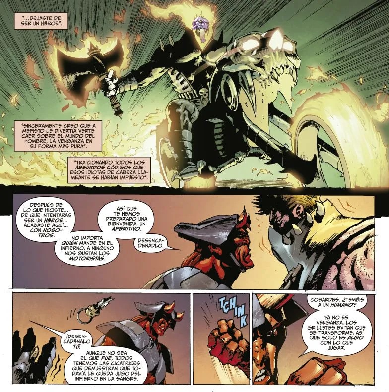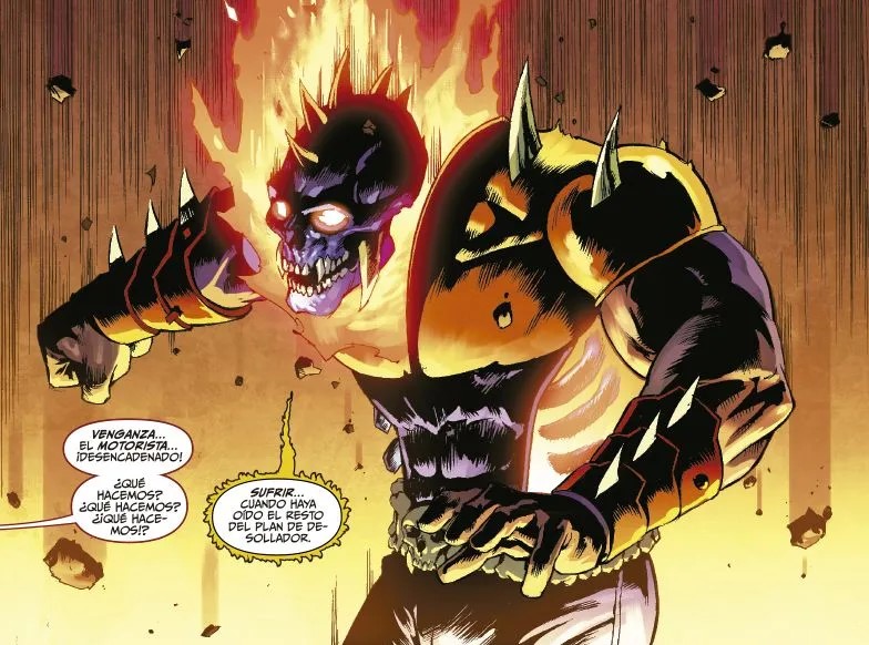 Quizás lo más irónico es que, mientras Pirzada intentaba unir a todos los Espíritus de Venganza en una hermandad infernal, lo que realmente consigue es demostrar lo redundante que se ha vuelto el concepto. Cinco personajes con el mismo poder, la misma maldición y distintas marcas de moto. ¡Demasiados cráneos en llamas para una sola autopista! Lo que en los noventa molaba, un solo motorista rugiendo contra el mal. Ahora se ha multiplicado hasta lo absurdo. Marvel tiene un ejército de motoristas fantasma, pero ninguno con la chispa única de aquellos primeros cómics donde Blaze o Ketch circulaban solos bajo la luna.