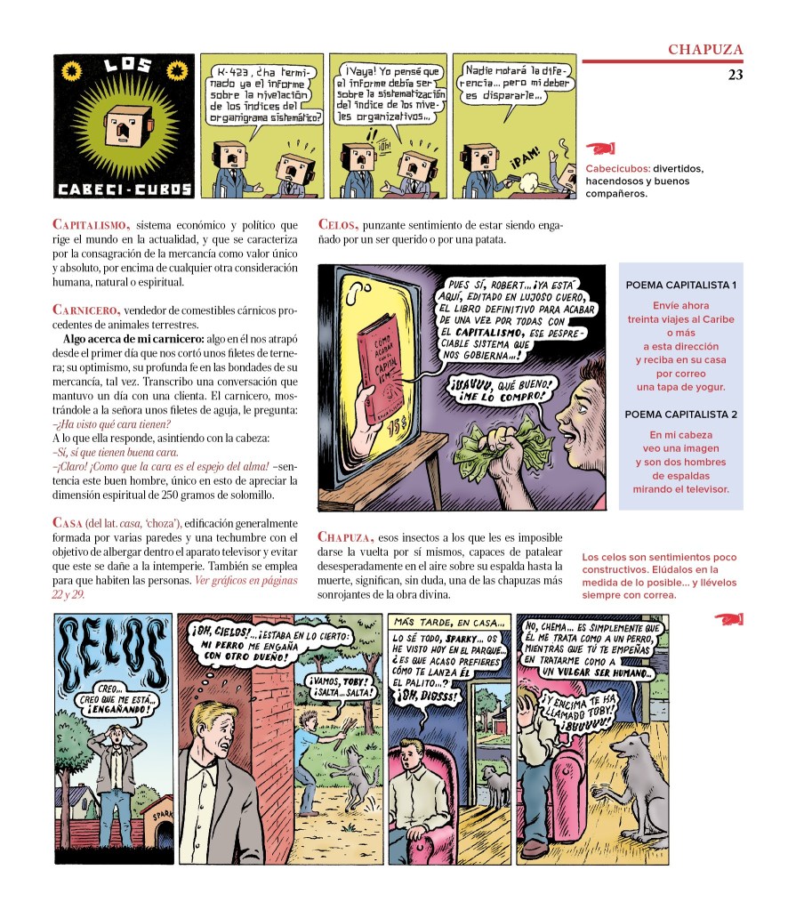 Brieva se pone el traje de alienígena para recorrer nuestro planeta y anotar, de la A a la Z, los delirios de una civilización que confunde el progreso con los “me gusta” y la libertad con el carrito de Amazon. Cada entrada de su enciclopedia es una radiografía satírica que podría haber firmado un filósofo griego con resaca o un payaso demente en pleno ataque de lucidez. ¿Adulto? “Residuo que queda tras el desvanecimiento de un niño”. ¿Rico? “Yonqui del dinero”. Es un apocalipsis explicado con humor, y encima con dibujos que parecen venir de una revista propagandística de los años 50 pasada por un centrifugado de LSD.