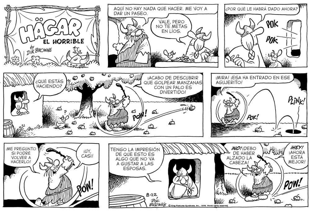El humor en estas páginas no grita, no golpea, no se repite. Es inteligente y preciso. Un humor que parece inocente hasta que lo relees y te das cuenta de lo bien apuntado que está el dardo. En tres viñetas, Browne era capaz de resumir la esencia de una pareja, de una crisis, de un pensamiento universal. Mientras otros hacían sátira a martillazos, él usaba el escalpelo de la observación. Donde otros dibujaban barbarie, él encontraba ternura. Donde otros escribían chistes, él hacía retratos. Y qué dibujo. Qué maravilla de línea. Browne no necesitaba más que unos trazos para crear mundos. Un trazo redondo, caricaturesco, amable. Sus personajes tienen peso, movimiento, carisma. Sin color, sin fondos elaborados, sin florituras. Todo funciona. En una época donde el exceso es la norma, su simplicidad es revolucionaria. Cada gesto, cada ceja levantada, cada sonrisa torcida, está perfectamente colocada para arrancarte una risa que no caduca. Además, Browne sabía algo que muchos humoristas olvidan. El verdadero humor nace del cariño. Nunca se ríe de sus personajes, sino con ellos. Incluso cuando Hägar mete la pata (que es casi siempre), lo hace con una humanidad tan genuina que te resulta imposible no quererlo. Es un desastre, sí, pero es nuestro desastre. Eso lo hace eterno.