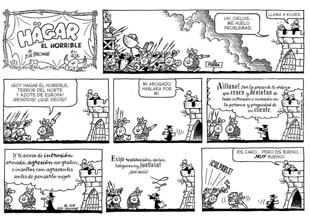 El tomo 1976–1977 es especialmente sabroso porque muestra al autor en plena madurez. Sus chistes fluyen con ritmo musical. Las tiras giran alrededor de temas universales: el matrimonio, la pereza, el trabajo, la comida, los hijos, los amigos y esa gran tragedia moderna que es intentar descansar sin que alguien te interrumpa. Hägar no se enfrenta a dragones, sino al tedio. Y en su lucha absurda contra lo cotidiano, triunfa. Porque nos recuerda que sobrevivir a la rutina también es heroico. Si algo logra este cómic es hacernos reír de nosotros mismos. La ironía en estas 192 paginas funciona hoy mejor que nunca. En tiempos de estrés laboral, crisis existenciales y dietas sin gluten, ver a un vikingo que lo resuelve todo con un eructo y una siesta tiene algo de redentor. Browne no propone soluciones: propone reírse. Eso, en sí mismo, ya es una forma de resistencia. Por eso, detrás de los cuernos y las espadas, hay críticas suaves al consumismo, al machismo, a la burocracia, al trabajo esclavizante y a la incomunicación familiar. Pero todo con la sonrisa puesta. Porque Hägar no te adoctrina: te hace reír, y cuando terminas de reírte, te das cuenta de que te ha dicho una verdad. Eso, en humor gráfico, es alquimia.