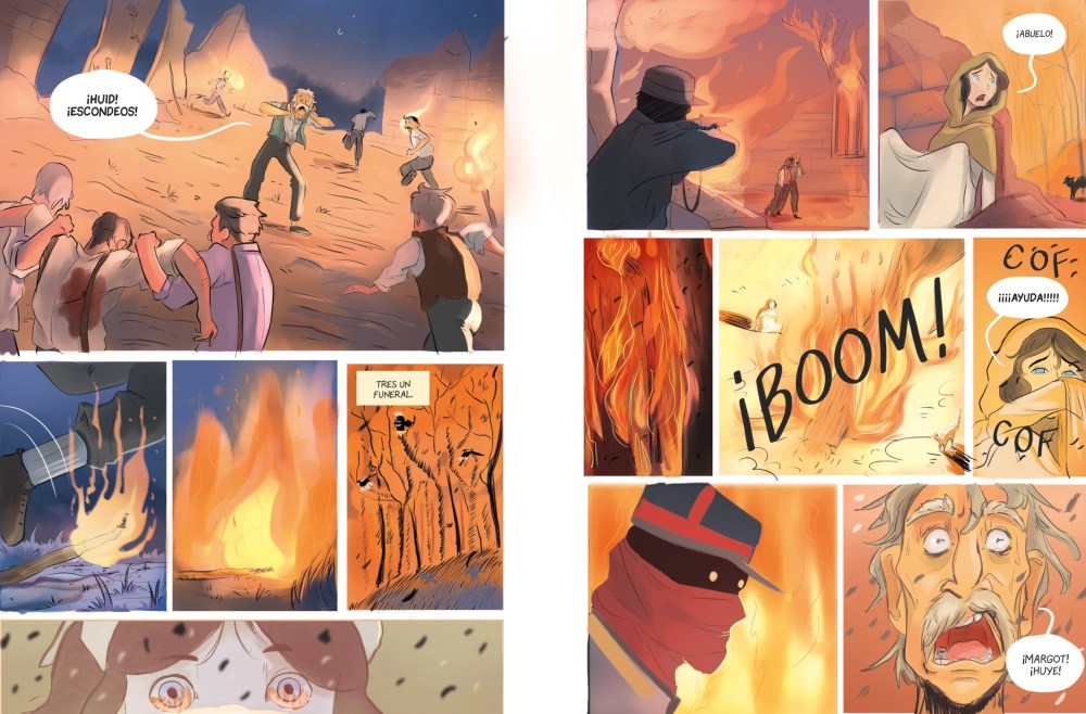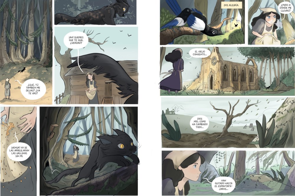 Arianna Pisani, por su parte, da vida a ese universo con un talento impresionante. Su dibujo parece moverse, como si cada viñeta respirara. Hay una textura táctil en sus páginas, un trazo que combina lo artesanal con lo cinematográfico. Las luces y sombras de los pinares, la humedad del bosque oscuro, la vibración del fuego en la noche o ese gato que podría llevarnos hasta el fin del mundo. Todo está ahí, con una belleza que no busca deslumbrar, sino emocionar. Pisani domina el color como quien toca un instrumento de cuerda. Cada tono tiene un peso diferente. Los verdes musgosos, los marrones cálidos y los amarillos apagados dan forma a un paisaje que, más que un escenario, es un personaje. Que nos recuerdan en que época nos encontramos donde los colores chillones no existen.