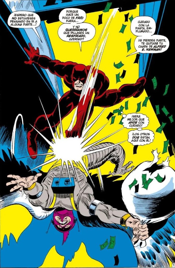El tomo recoge los números #40 al #45 de la serie original y empieza en todo lo alto. Daredevil contra los Tres Impíos, encabezados por un villano con nombre de peli de serie B, el Exterminador, que se toma tan en serio su trabajo que da ternura. Es el típico malo que grita sus planes en voz alta, da tiempo al héroe para escapar y aun así consigue mantener el suspense. El enfrentamiento es pura coreografía de Colan: saltos imposibles, poses de ballet con porra y sombras que parecen tener vida propia. No hay ni un momento para respirar, y cuando crees que ya has visto todo ¡Stan Lee saca otro truco de su sombrero! Porque tras derrotar al Exterminador, llega El Bufón. Sí, un tipo disfrazado de payaso que lanza trucos de feria y monólogos malos. Un villano que parece haber salido de una función de colegio pero que, contra todo pronóstico, funciona. Es tan ridículo que se convierte en icónico. Su debut es una de esos detalles marvelitas donde lo absurdo se abraza sin vergüenza. Daredevil, el héroe ciego más serio de la ciudad, luchando contra un bufón que hace reír solo por no tener gracia. Hay un tono de parodia, un sentido del humor interno que le da frescura al cómic. Daredevil se frustra, el Bufón improvisa, y nosotros disfrutamos del espectáculo con palomitas imaginarias.