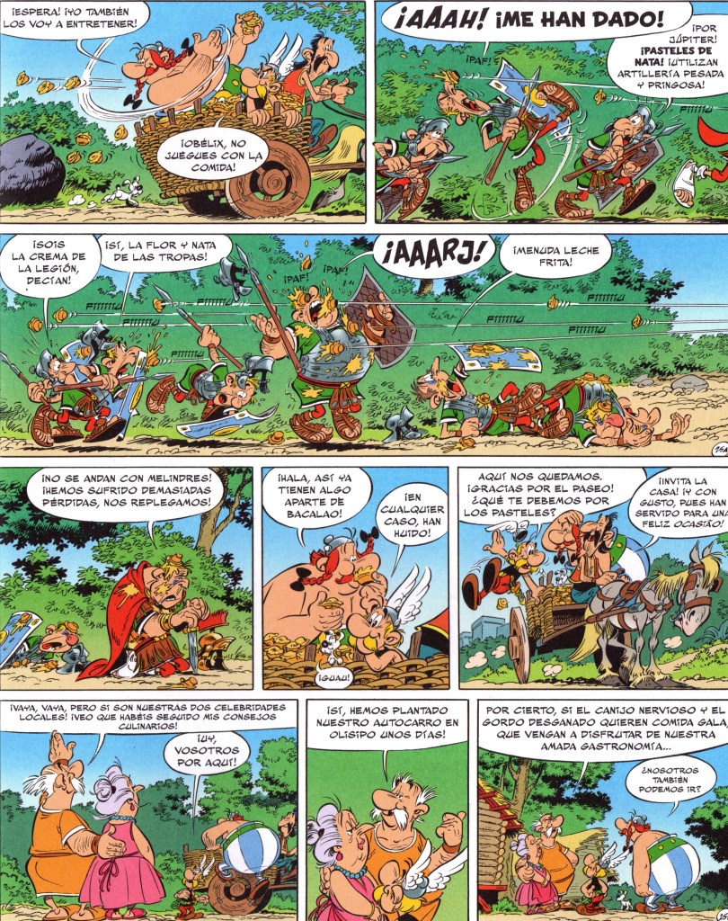 Desde las primeras páginas, el viaje promete. Obélix está entusiasmado con la idea de probar la comida del lugar y Astérix mantiene la cabeza fría, como siempre. Pero pronto llega el primer choque cultural: “¿Bacalao otra vez? ¿Dónde están los jabalíes?”. Ahí empieza el festival de chistes gastronómicos, musicales y sentimentales que, entre tú y yo, funcionan mejor cuando los protagoniza el grandullón. Por otro lado la saudae , esa melancolía con glamour que los portugueses han elevado a categoría de arte, se convierte en el verdadero enemigo del álbum. Y no hay poción mágica que la cure. De hecho, una de las mejores escenas del tebeo es cuando una tropa romana, lista para atacar, se topa con un fado tan deprimente que decide rendirse. “Bah, con ánimo o sin él, el final será el mismo”, musita un legionario con ojeras existenciales. Y ahí tienes, en una viñeta, la definición perfecta del espíritu lusitano.