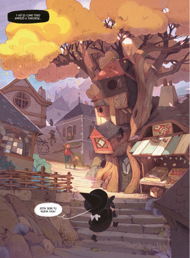 En el aspecto gráfico, los dibujos de Carine Hinder son, sencillamente, una delicia. Redondos, cálidos, llenos de movimiento y color. Cada viñeta parece una postal de un sueño bonito. Las luces del bosque, los rostros expresivos, el pelaje del cerdito, la niebla que se cuela entre las ramas. Es un estilo que mezcla lo infantil con lo cinematográfico, lo tierno con lo aventurero. Uno podría quedarse un rato largo solo mirando los detalles, los tonos suaves, las pequeñas miradas cómplices entre los personajes. Hinder logra algo precioso, que el lector sienta que está dentro de ese pueblo, respirando, oliendo las pócimas o escuchando como Bruma empieza a faltar a todo aquel que se le cruza en su camino.