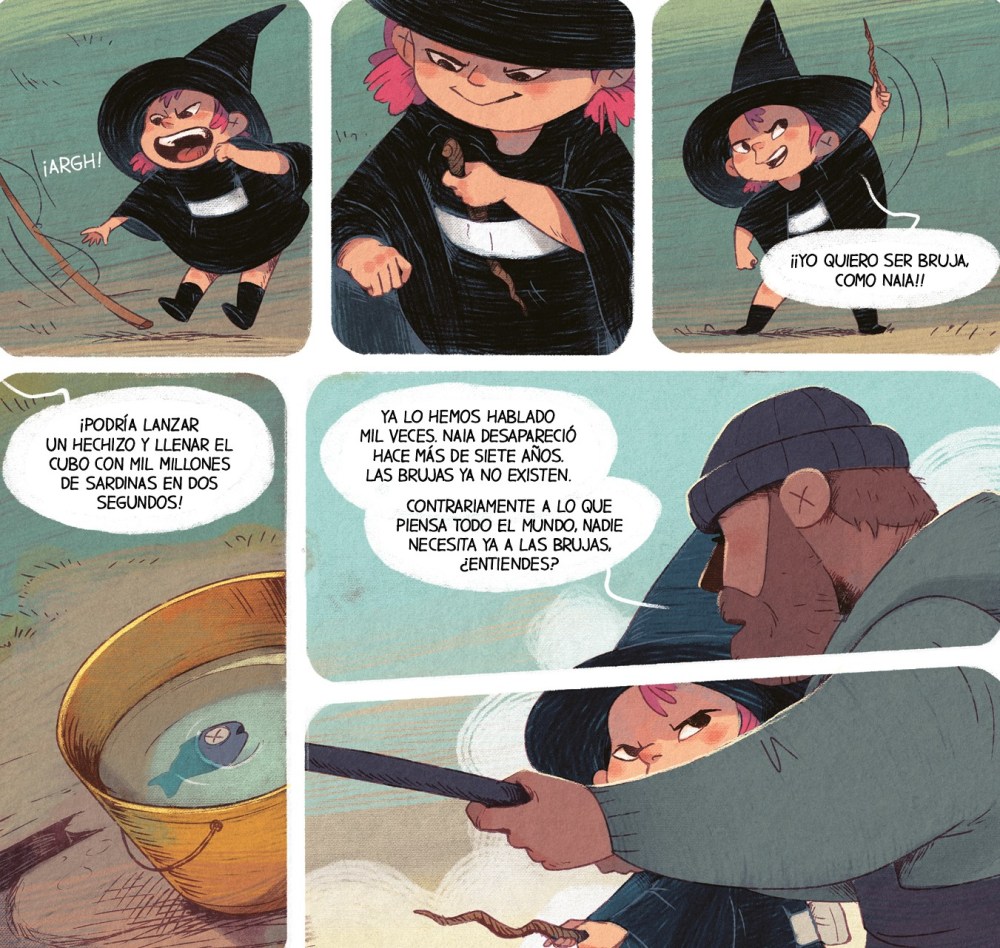 La edición de Astiberri es preciosa, cuidada, con una traducción muy natural de Diego de los Santos que mantiene la frescura y el ritmo del original. Es uno de esos libros que da gusto tener en las manos. El papel, los colores y el formato grande que deja respirar los dibujos. Además de multitud de extras que es mejor no desvelar. Todo invita a disfrutarlo con calma, con esa sensación de estar sosteniendo algo especial. Porque esta pequeña brujita tiene ese poder que solo poseen las buenas historias. Te hace sonreír sin cinismo, te hace recordar que alguna vez creíste en dragones, en brujas y en cerdos que hablan con la mirada.